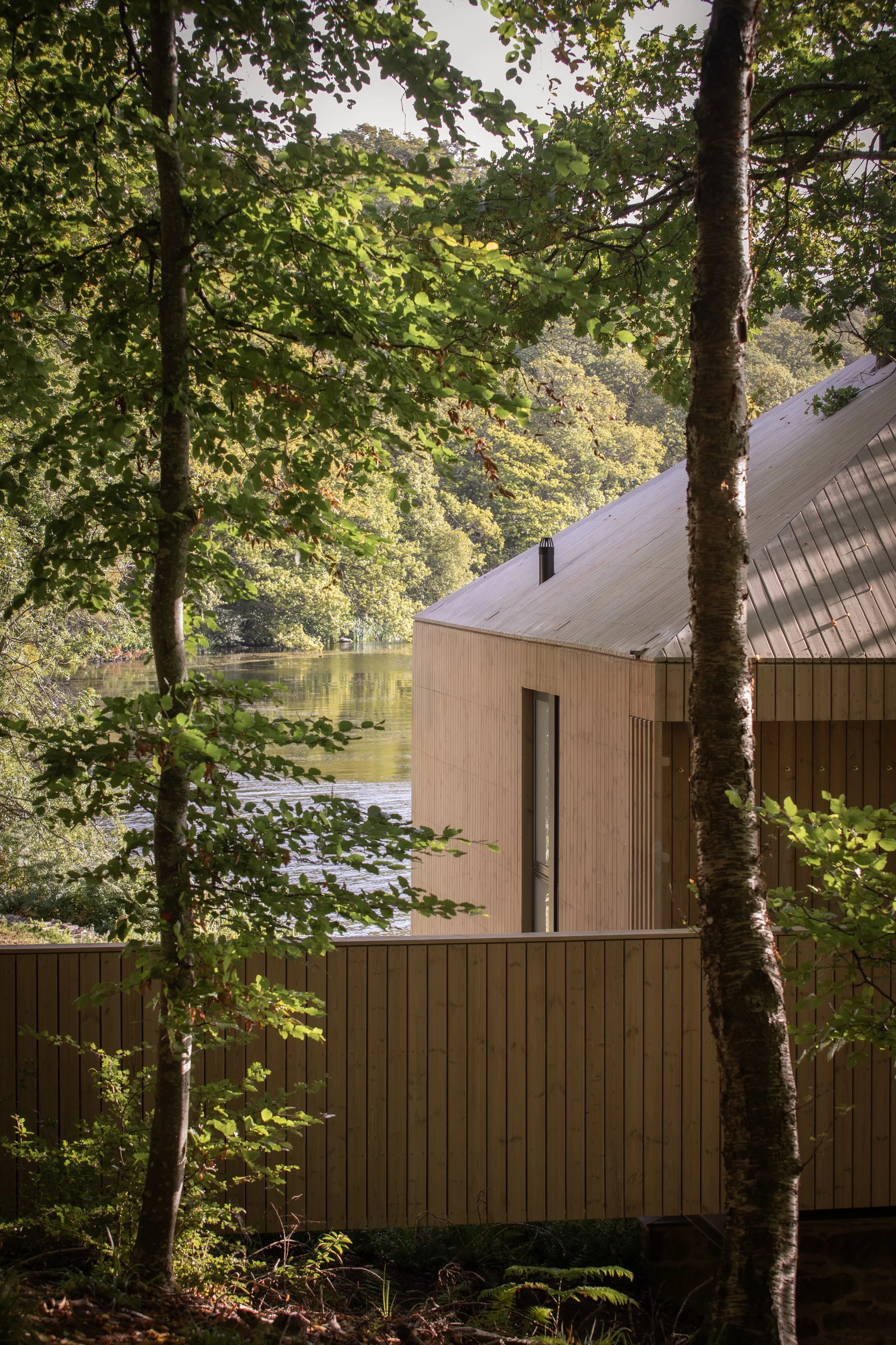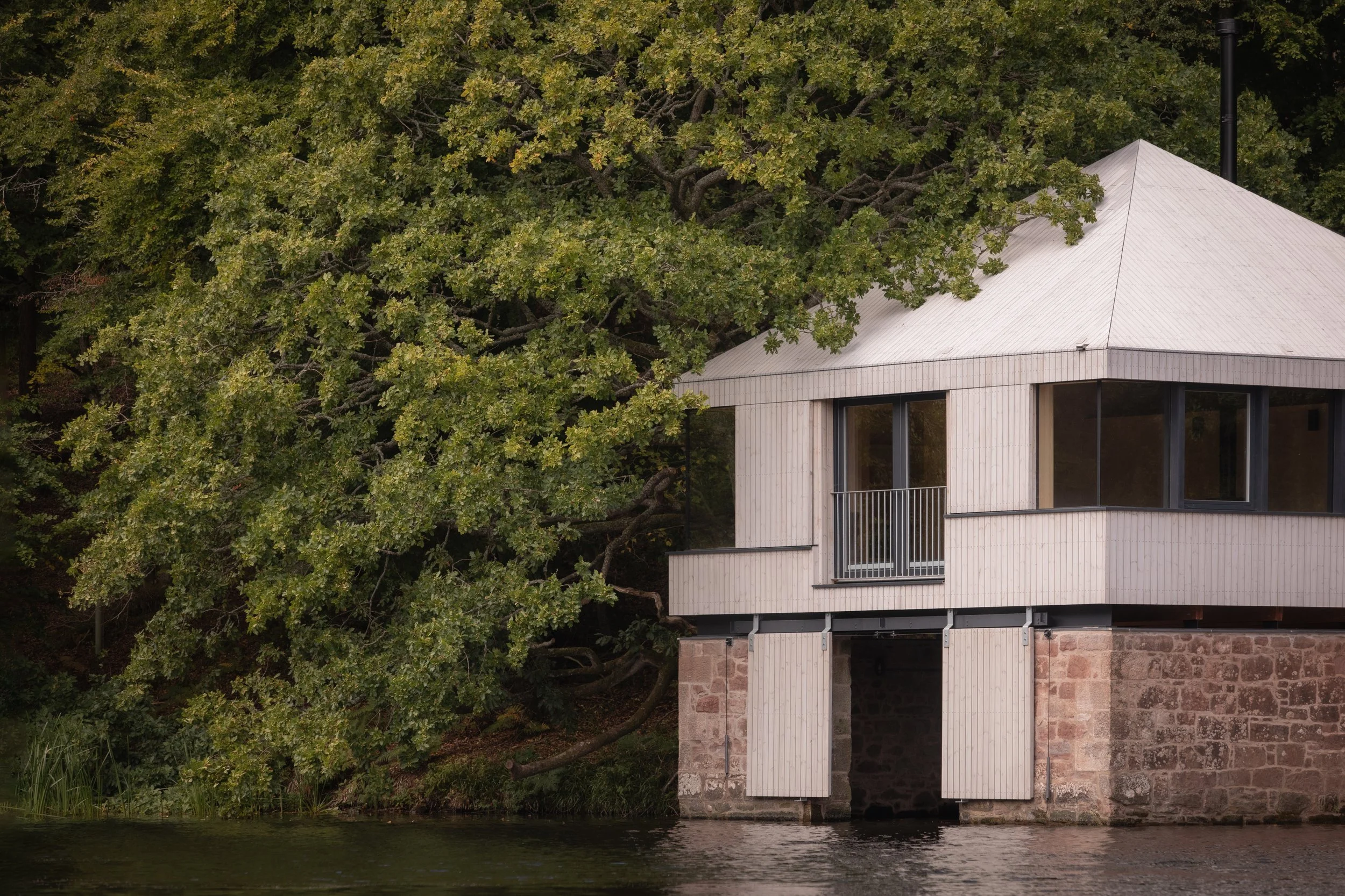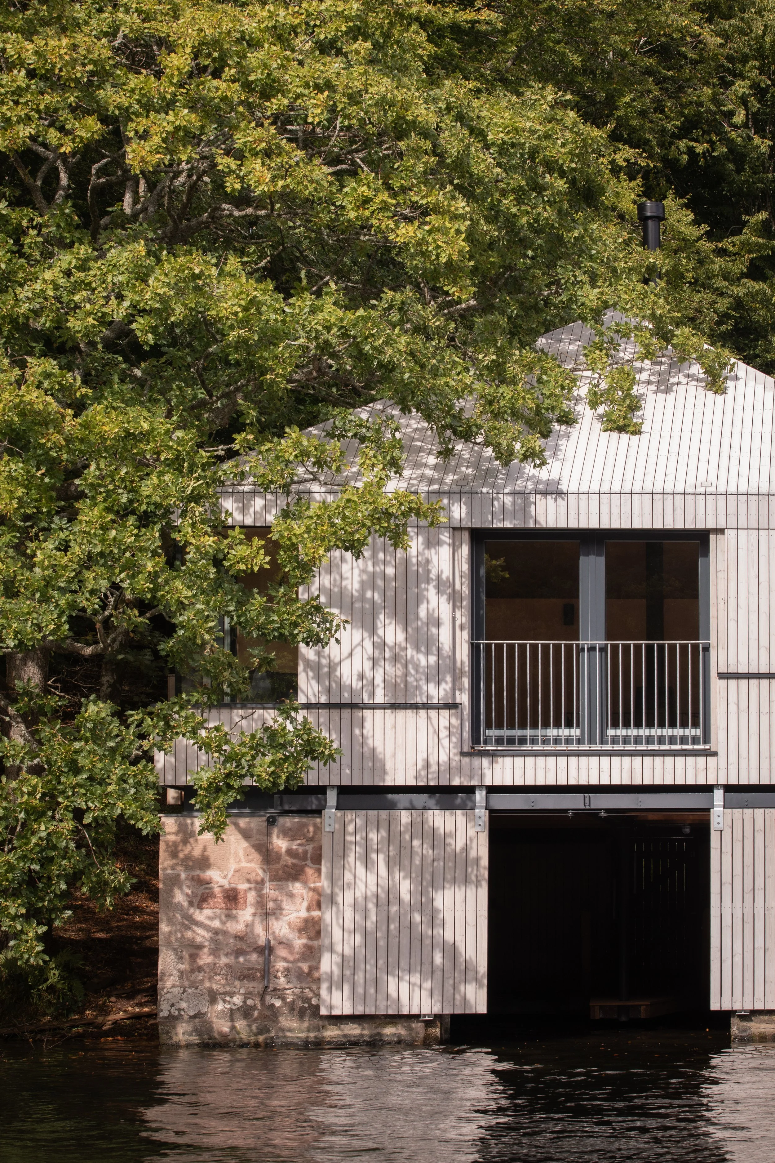 The Boathouse involved the meticulous refurbishment and expansion of an old loch-side boathouse, alongside the creation of a new studio and bothy. The studio sits lightly above the original stone walls, its roof echoing the form of the original pyramidal slate-tiled roof. From its elevated position, it captures expansive views across the water to the woodland beyond. Clad entirely in Thermopine that will silver with time, and lined within by warm ash-veneered surfaces, the studio nestles into its woodland setting, surrounded by tall ash trees and cradled in the branches of an ancient oak.