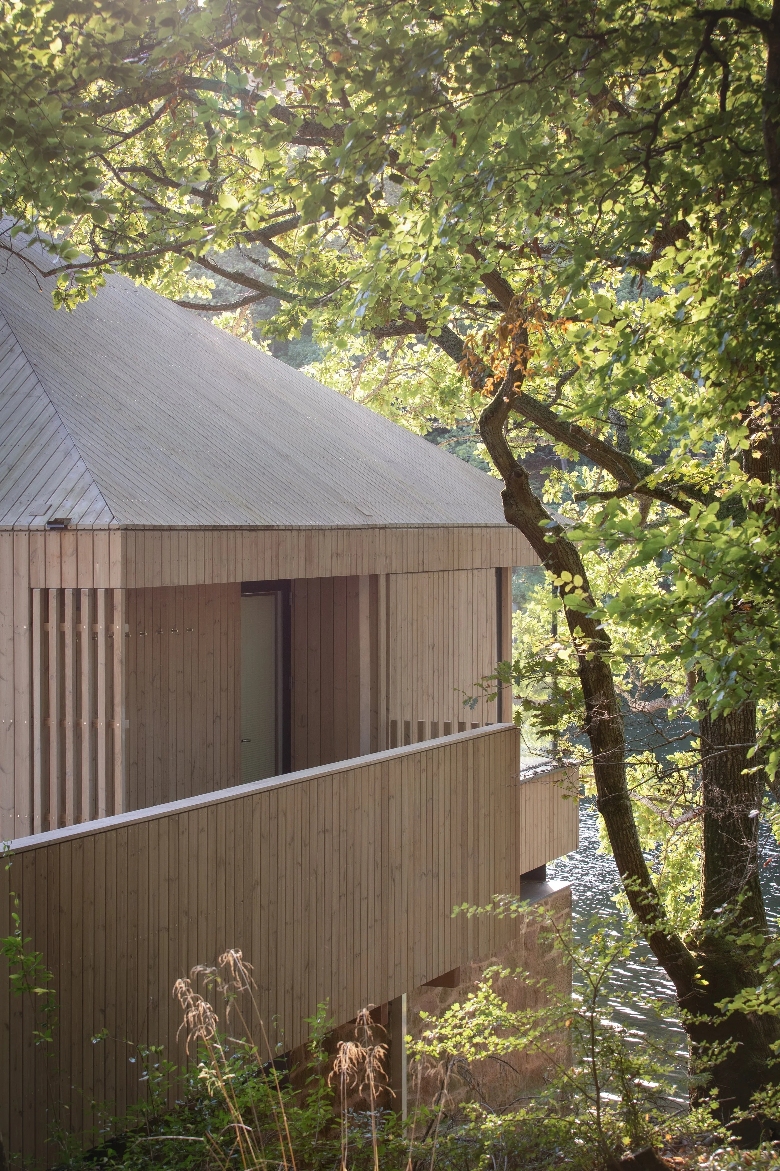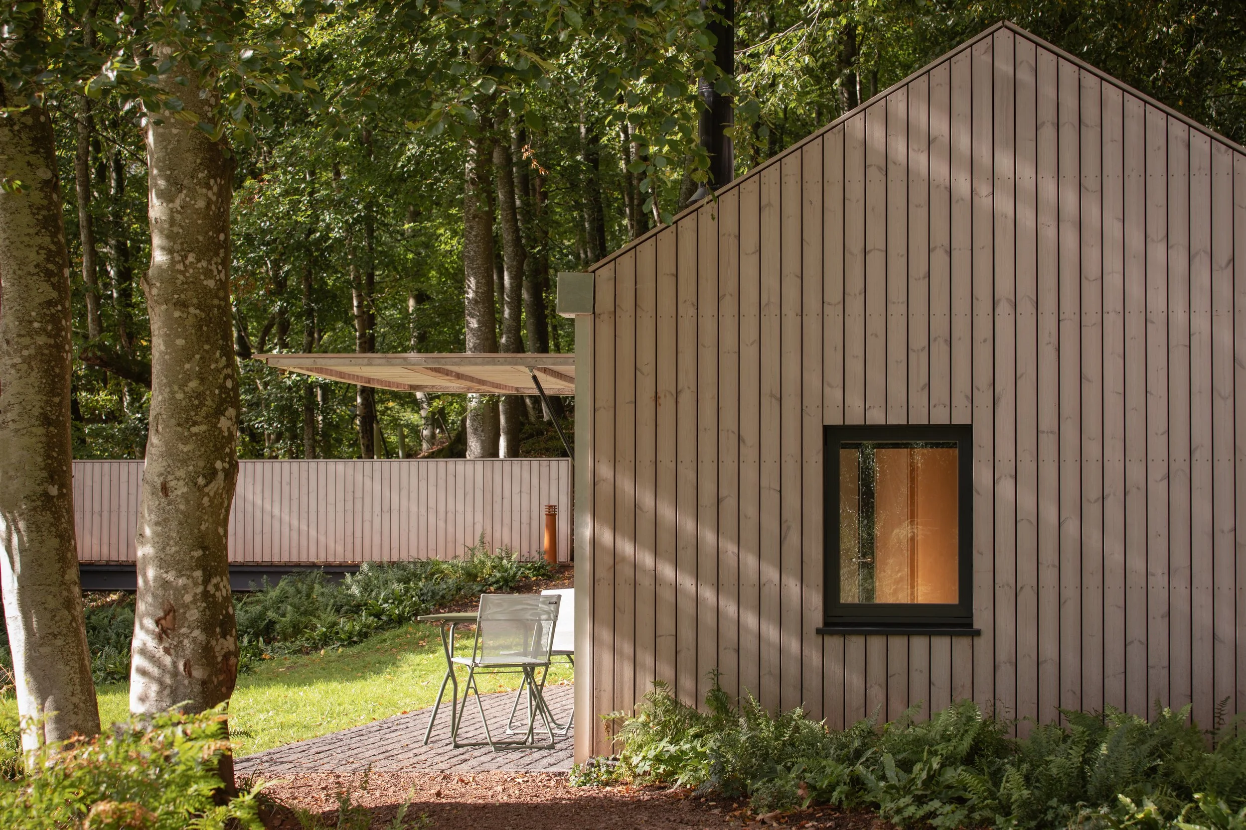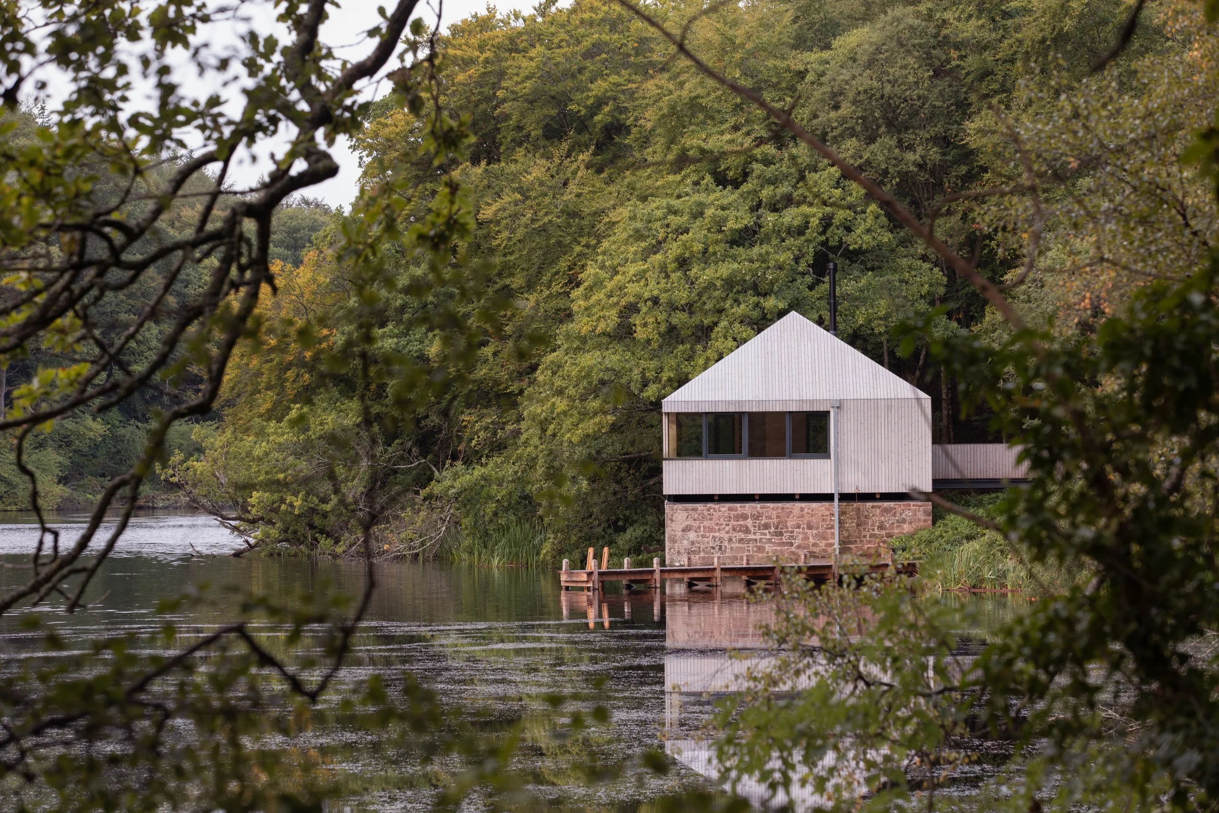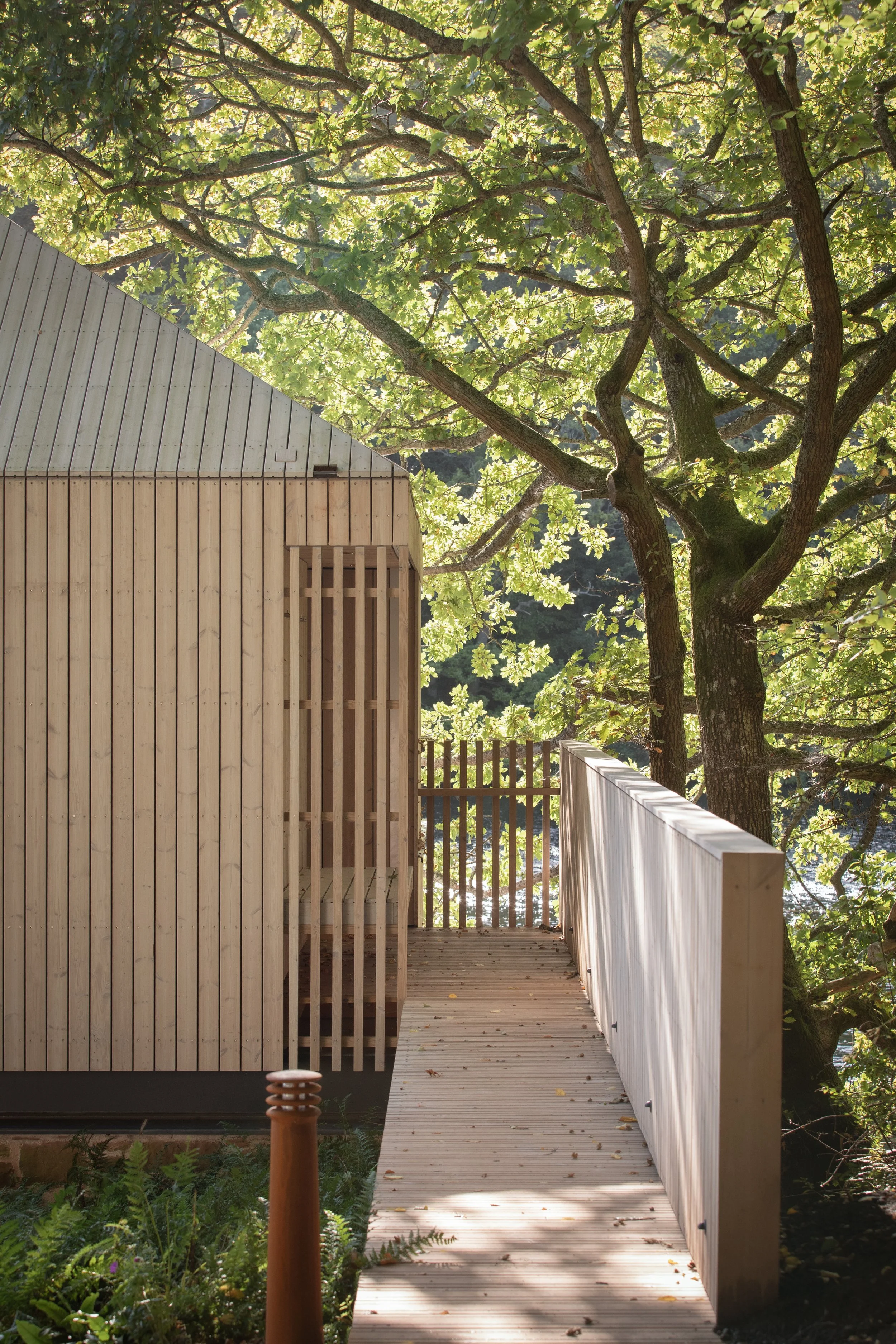 The Boathouse involved the meticulous refurbishment and expansion of an old loch-side boathouse, alongside the creation of a new studio and bothy. The studio sits lightly above the original stone walls, its roof echoing the form of the original pyramidal slate-tiled roof. From its elevated position, it captures expansive views across the water to the woodland beyond. Clad entirely in Thermopine that will silver with time, and lined within by warm ash-veneered surfaces, the studio nestles into its woodland setting, surrounded by tall ash trees and cradled in the branches of an ancient oak.