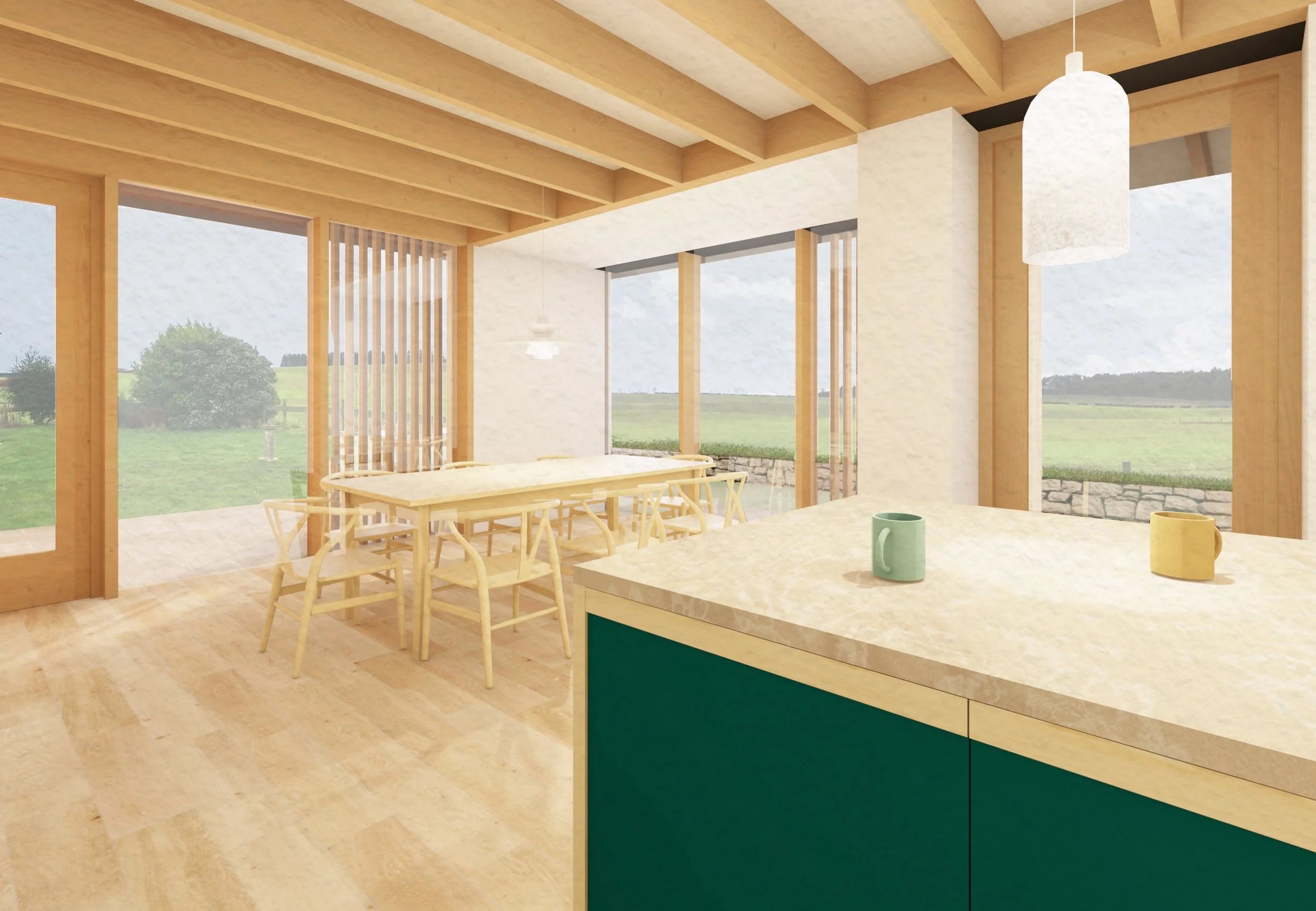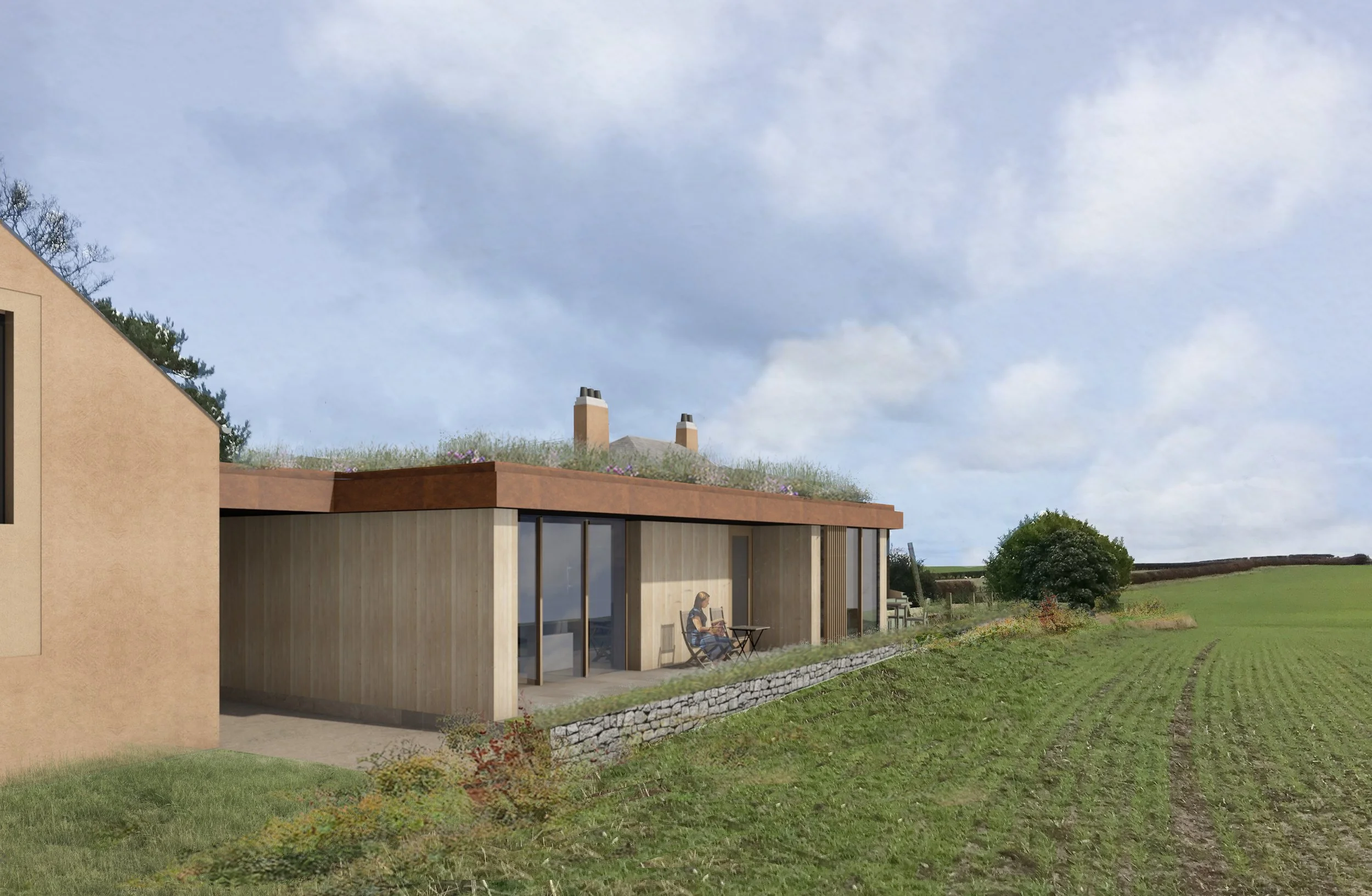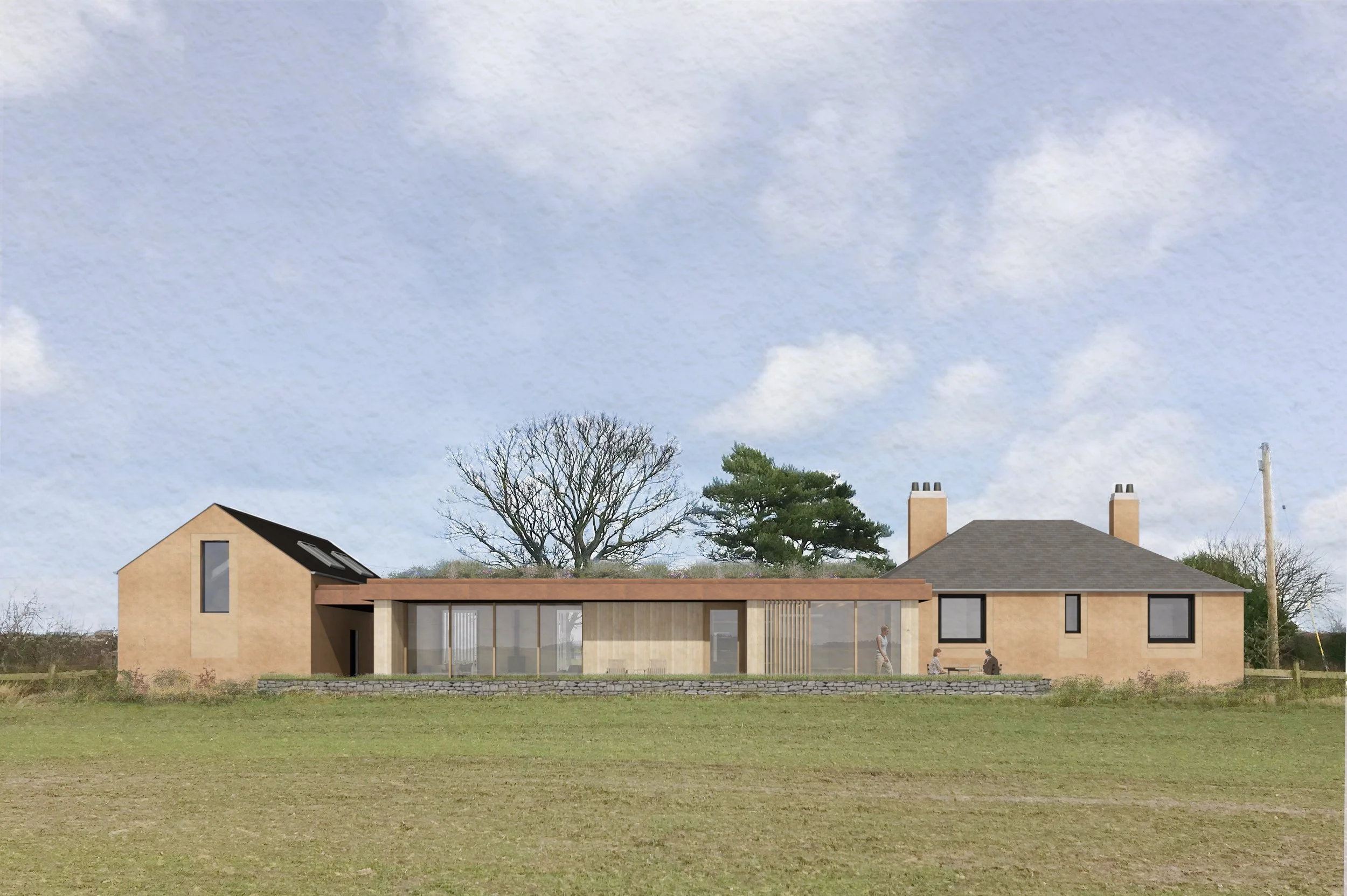 We have created designs for the alteration and extension of an existing house and outbuilding which sit within the gardens and paddocks of Newmains Holdings. Respecting post-WWII era designs for ex-servicemen, our brief was to bring the house up to modern standards, improving its sustainability and accessibility for the client and their young family. Designs focus on providing strong connections to the gardens through expansive social spaces; The existing outbuilding will be converted into a home office space on a new first floor level, a single storey extension will house a living area whilst a new wildflower roof which connects the buildings promotes biodiversity alongside the natural, breathable and low-embodied energy materials which will be incorporated.